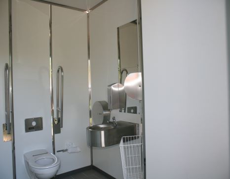 Bygningen på 9 m2 har to toiletrum, til damer og herrer og handicap brug. Bygningen er udstyret med et teknikrum, hvor sammenkobling af el og vand foretages. Her er også plads til opbevaring af forbrugsstoffer.